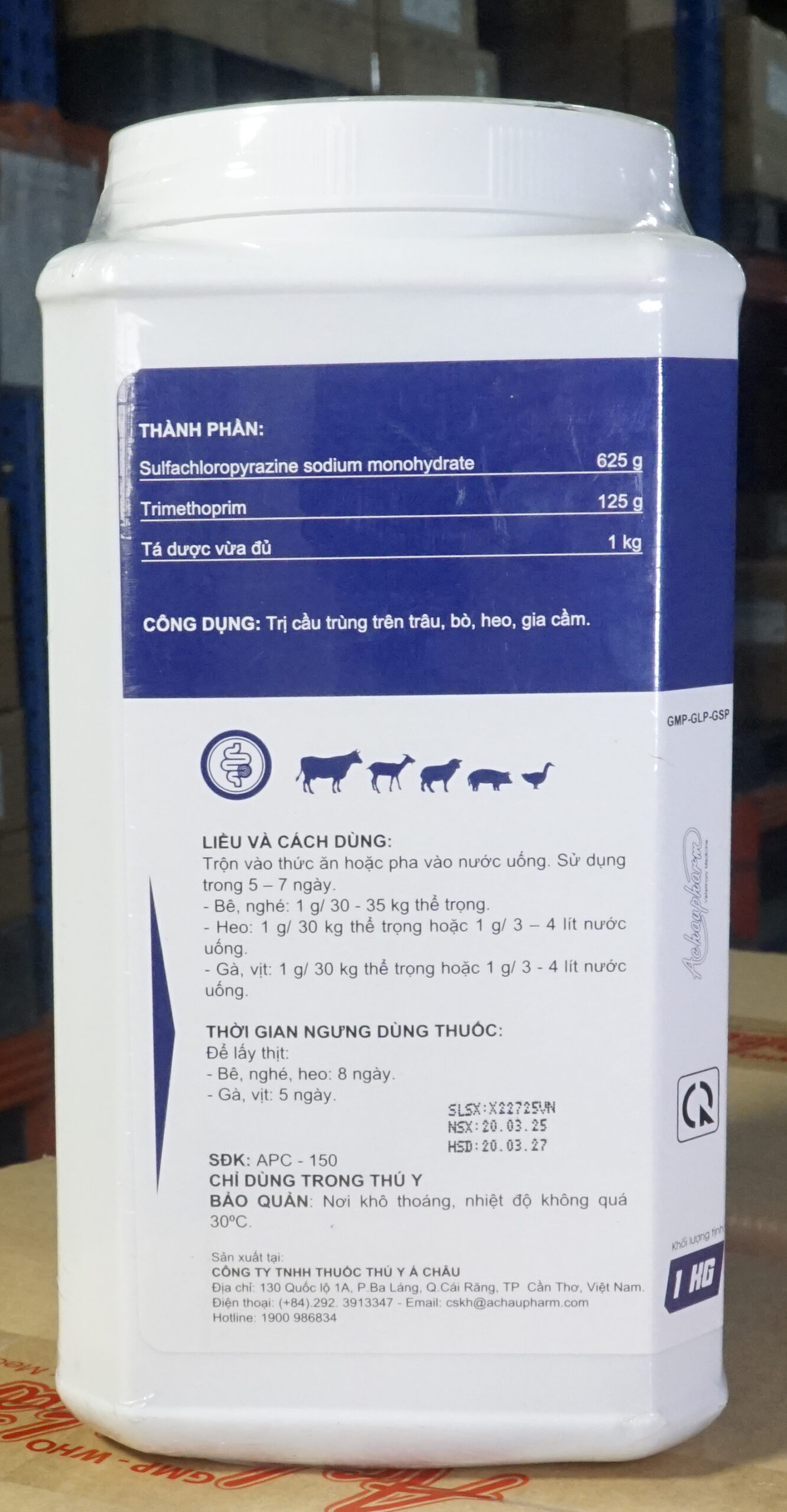 – Heo: 1 g/ 30 kg thể trọng/ ngày hoặc 1 g/ 3 – 4 lít nước uống.